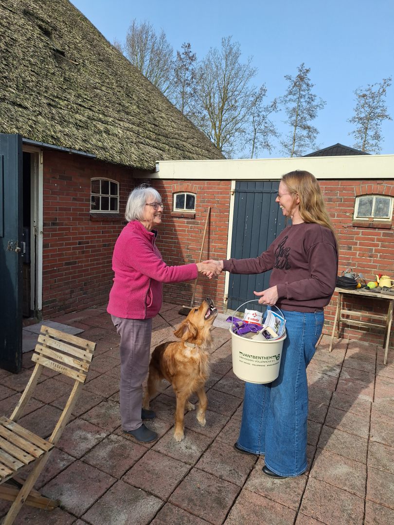 Vandaag hebben we Neeltje en Inne thuis gebracht bij Henk en Janny en hebben we het eerste kraamcadeau ( een goed gevulde emmer met o.a. beschuit met muisjes, een voerkop, waardebonnen voor gratis MERRIELACTO BROK en gratis VEULENBROK van Van Benthem Diervoeders Vollenhove overhandigd! Henk en Janny, van harte gefeliciteerd en heel veel geluk gewenst met dit luxe veulen!