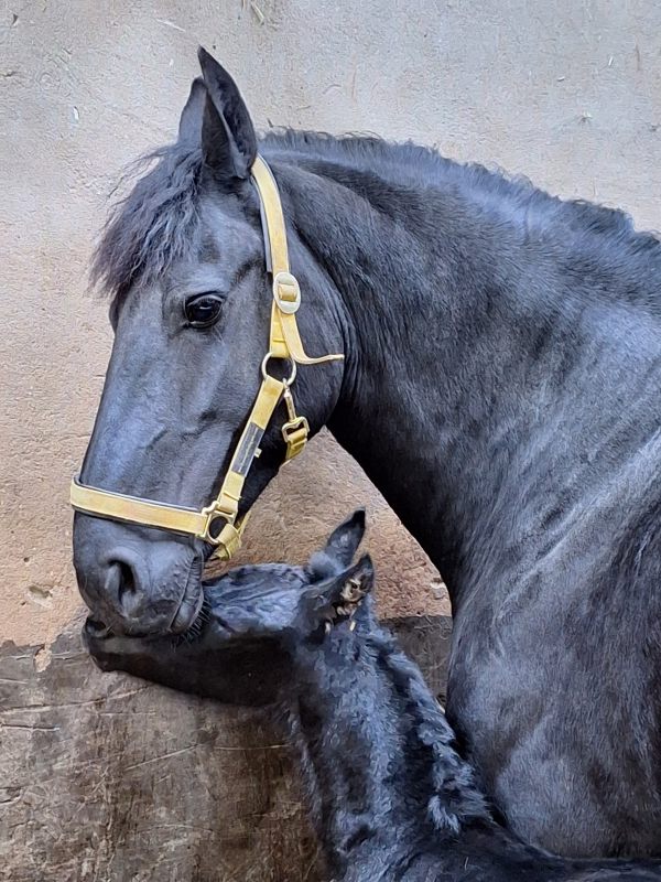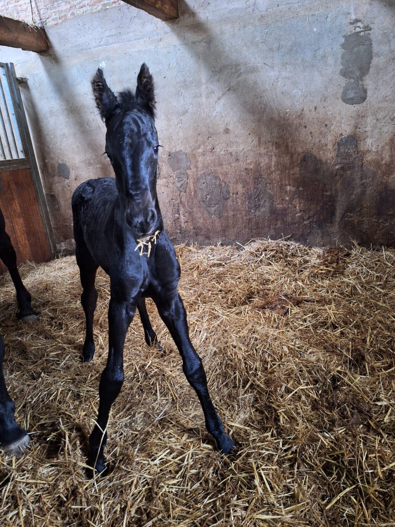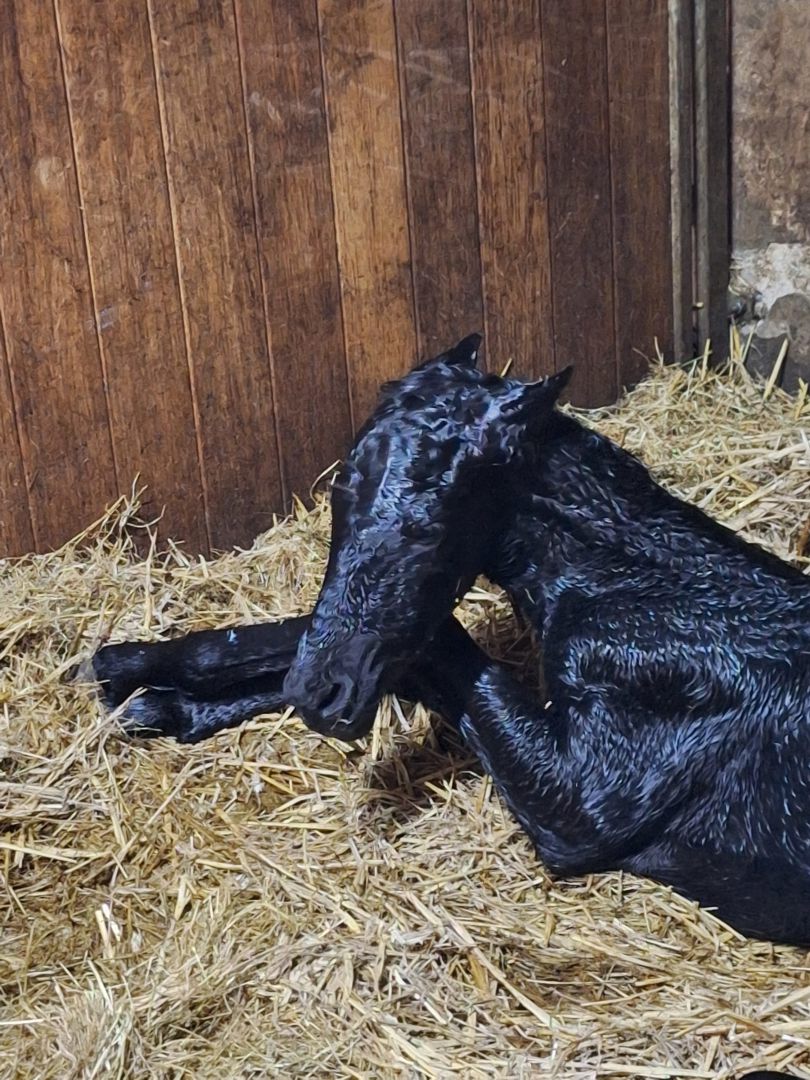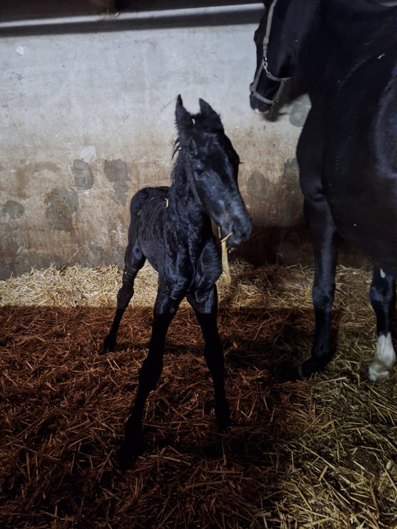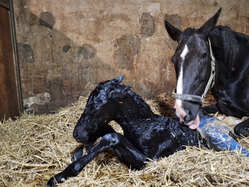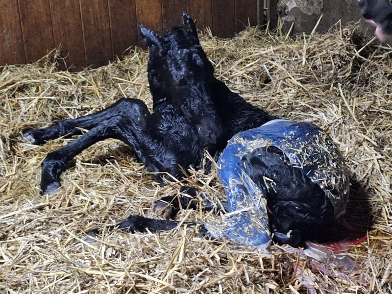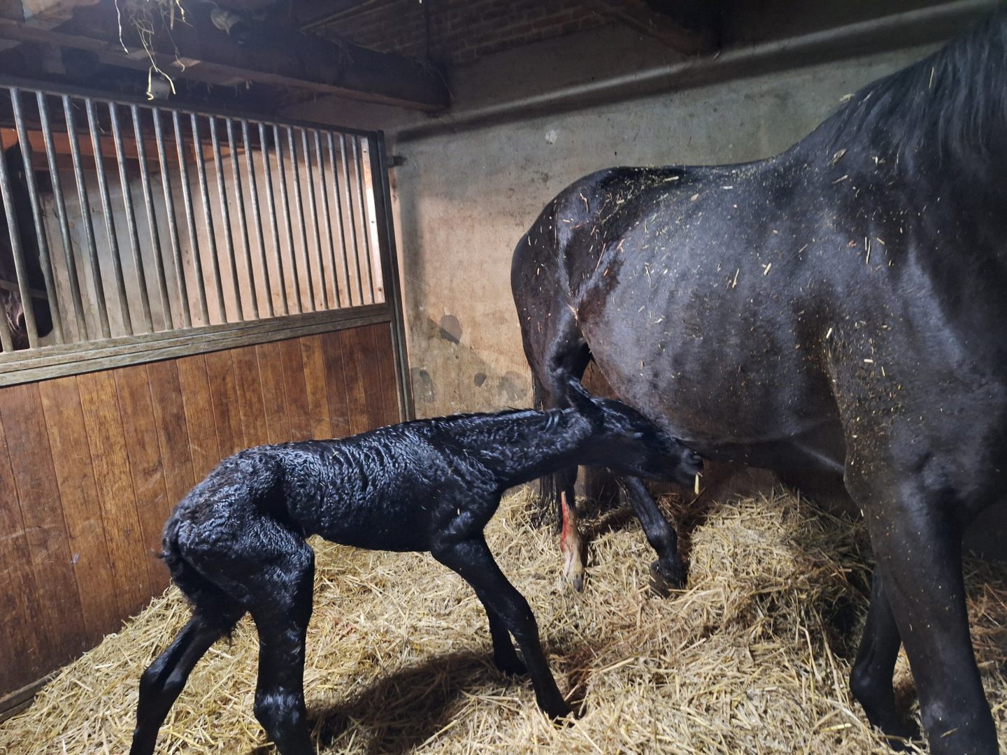 De draagmerrie Sensation Dance, drachtig van de combinatie Mystieke Dame (v. Maurus 441) voorlopig kroon x Bartele 472 in eigendom van Jenny Boonstra liep inmiddels ook 8 dagen over tijd. Maar 9 maart kondigde de bevalling zich aan. Sensation Dance beviel mooi vlot van een merrieveulen: Iebeltje van Stal Boonstra. Iebeltje is een heel luxe, hoogbenig veulen en was direct een helder en alert veulen. Ze stond vlot en wist het uier ook gauw te vinden. De biest was van goede kwaliteit; Brixwaarde >25. En gelukkig kwam het nageboorte ook compleet en op tijd af. Sensation en Iebeltje maken het goed. Jenny van harte gefeliciteerd met deze mooie aanwinst voor jullie fokkerij.