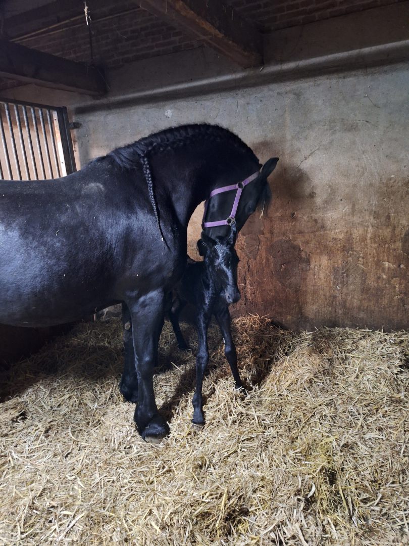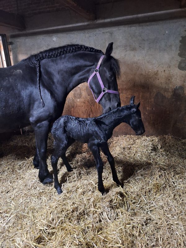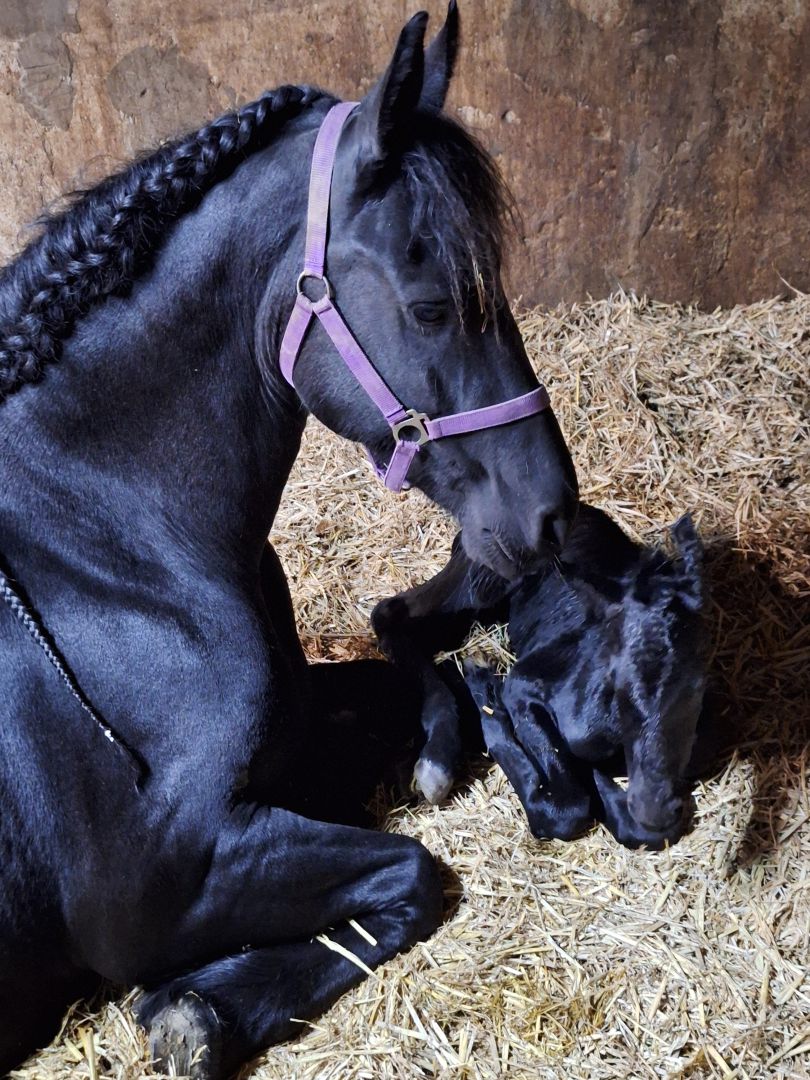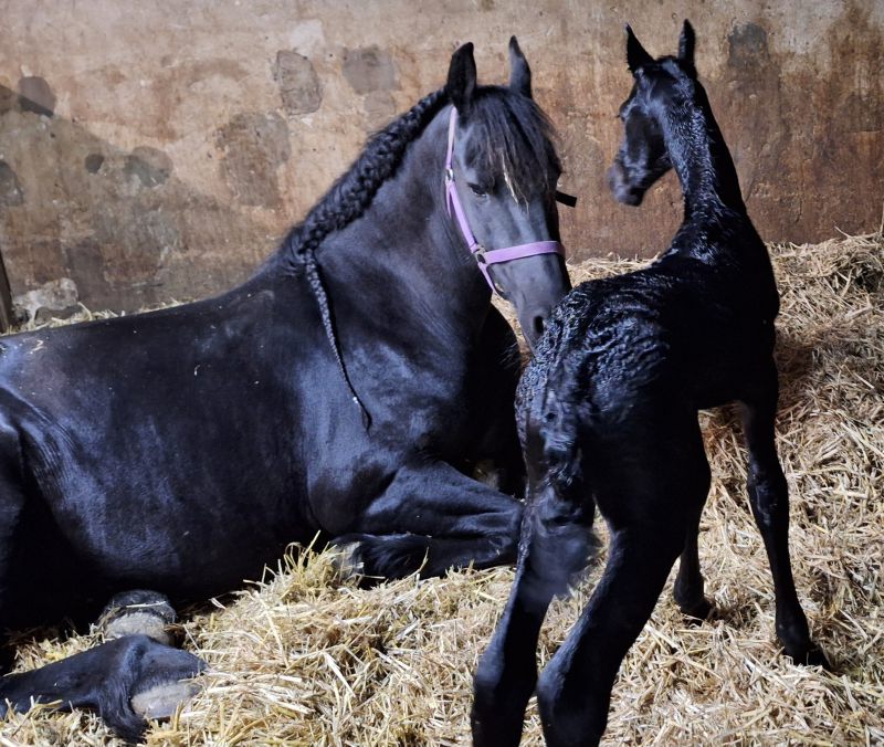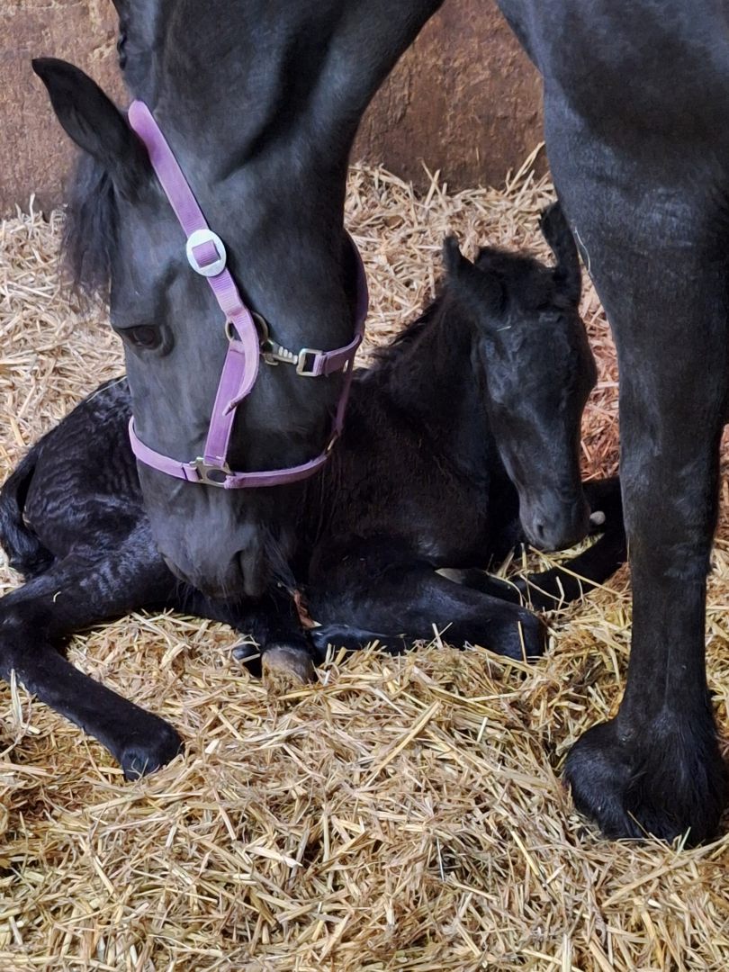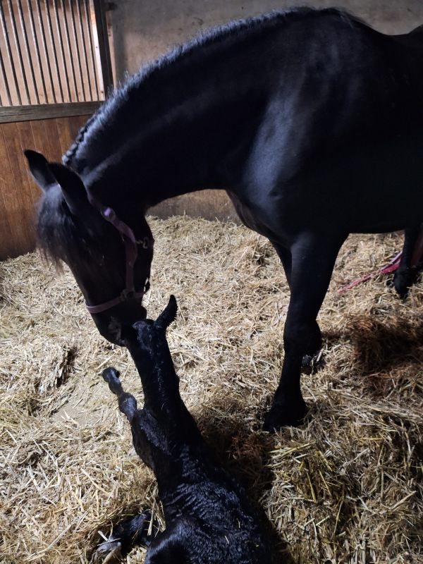 Voorgaande keren beviel Hanna precies op de uitgerekende datum. Acceptatie van het veulen was wel een aandachtspunt. Zaterdag 28 maart zagen we dat Hanna haar uier vol was en kreeg Hanna een lekkere wasbeurt en nieuwe vlechten. Wij verwachtten dat het veulen dit jaar niet op de uitgerekende datum zou worden geboren maar eerder. En dat was ook zo, want zondag 29 maart ging om iets voor 2.00u het geboortealarm af. Aangekomen in de stal lag het veulen al half uit Hanna. Hanna beviel heel snel van een heel luxe merrieveulen: Iefke fan de Suihoek. En in tegenstelling tot de voorgaande keren, toonde Hanna nu direct belangstelling voor Iefke. We deden onze verzorging (biestcontrole, navel ontsmetten, nageboorte verzwaren,etc.) en lieten Hanna en Iefke toen alleen. Via de camera hielden we vanuit de keuken alles in de gaten.