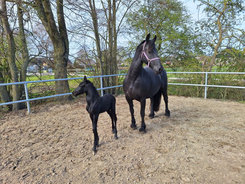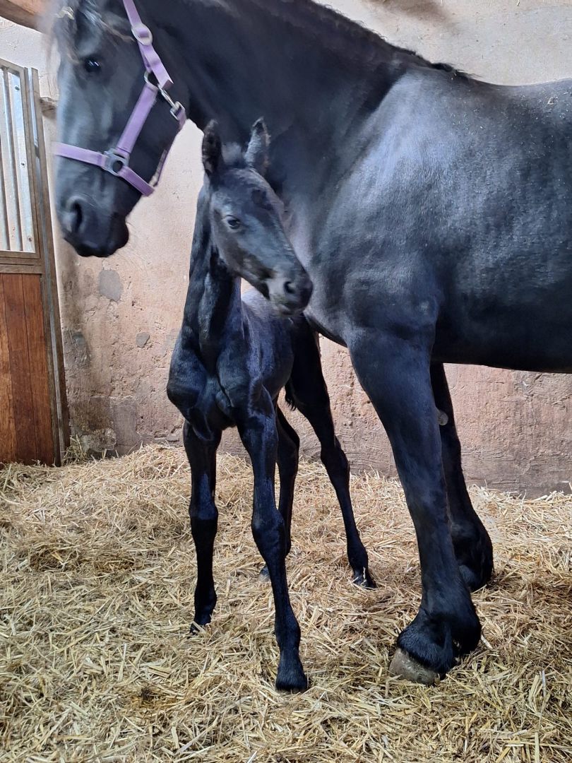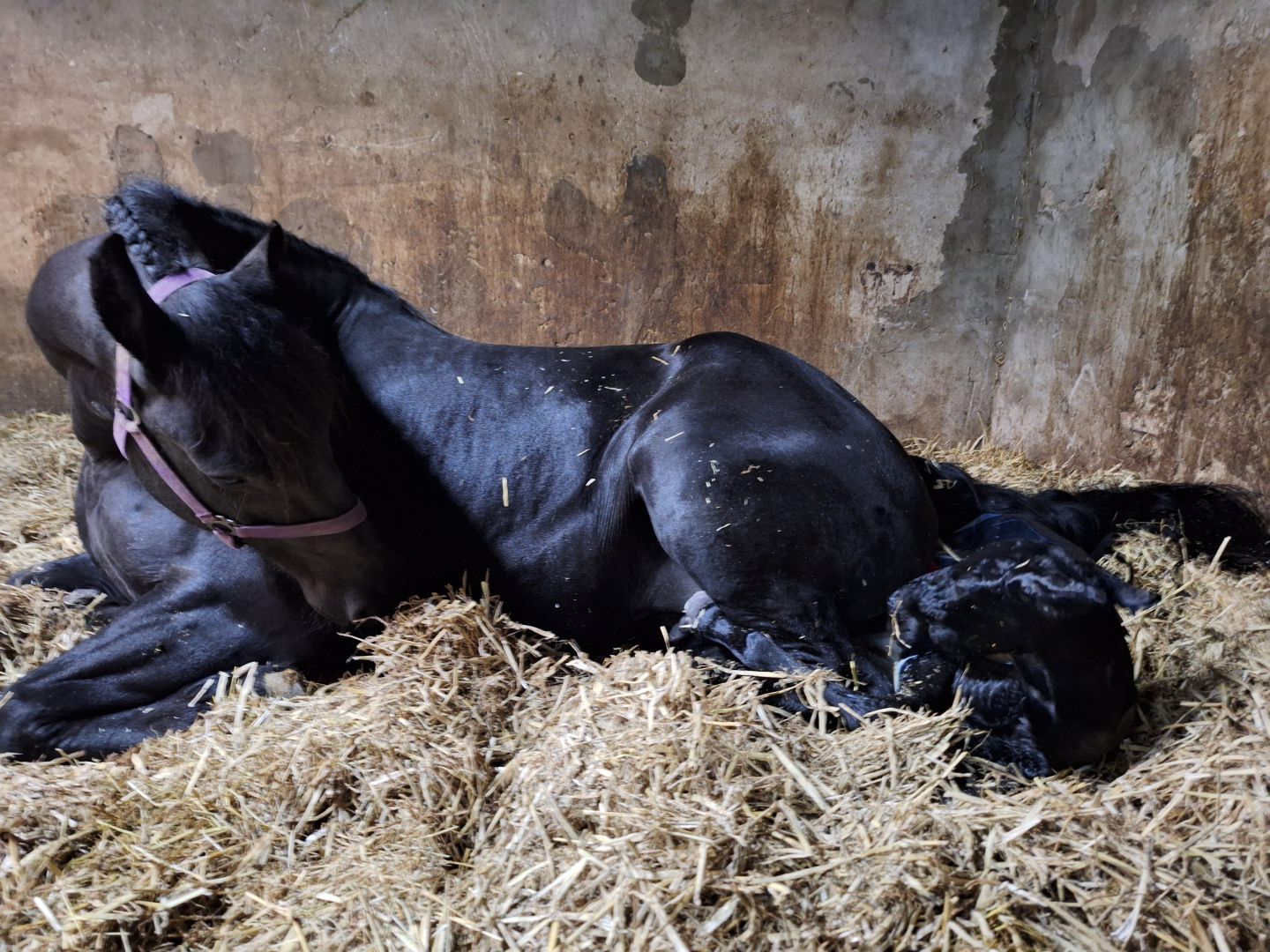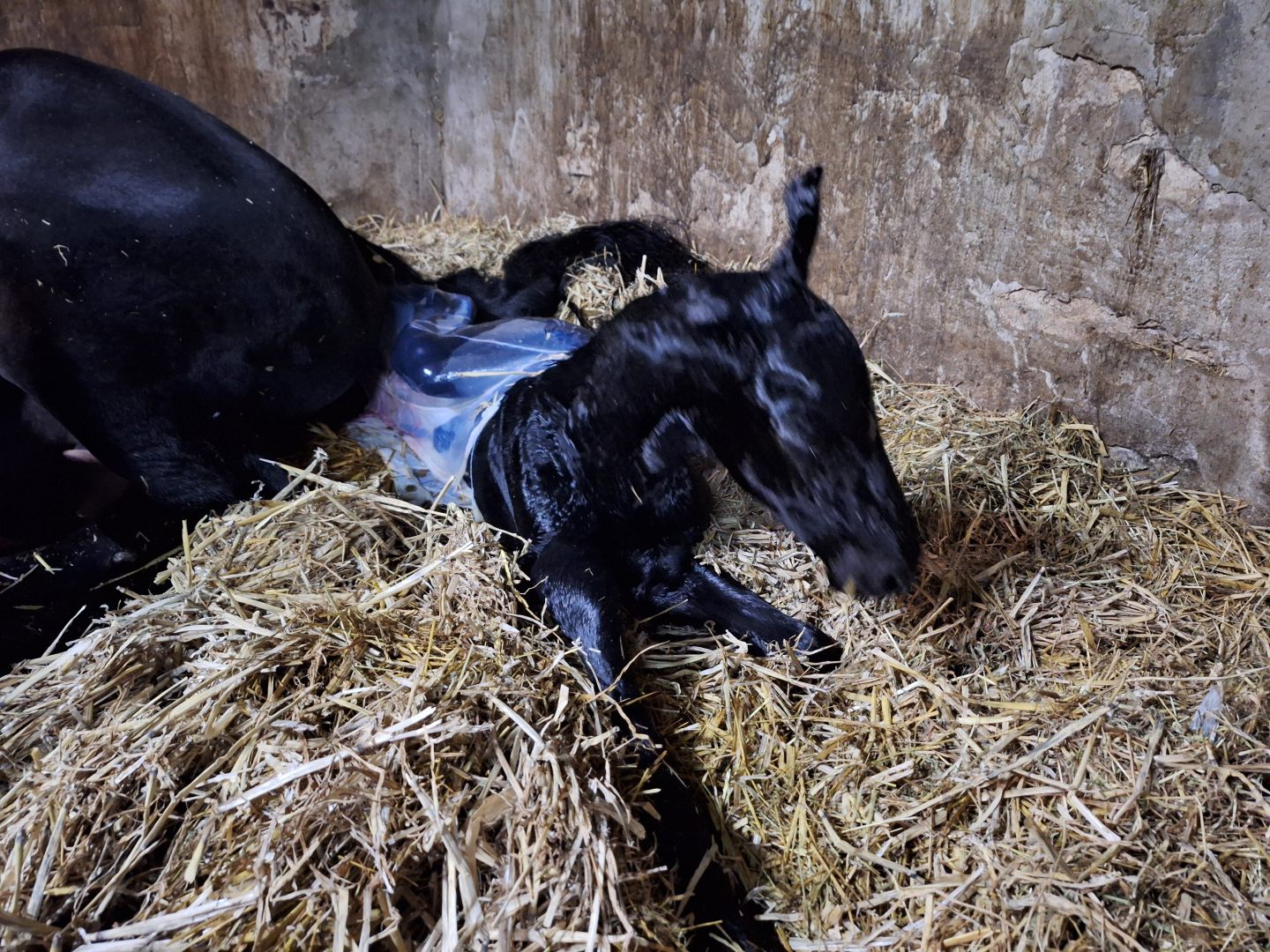 Voorgaande keren beviel Hanna precies op de uitgerekende datum. Acceptatie van het veulen was wel een aandachtspunt. Zaterdag 28 maart zagen we dat Hanna haar uier vol was en kreeg Hanna een lekkere wasbeurt en nieuwe vlechten. Wij verwachtten dat het veulen dit jaar niet op de uitgerekende datum zou worden geboren maar eerder. En dat was ook zo, want zondag 29 maart ging om iets voor 2.00u het geboortealarm af. Aangekomen in de stal lag het veulen al half uit Hanna. Hanna beviel heel snel van een heel luxe merrieveulen: Iefke fan de Suihoek. En in tegenstelling tot de voorgaande keren, toonde Hanna nu direct belangstelling voor Iefke. We deden onze verzorging (biestcontrole, navel ontsmetten, nageboorte verzwaren,etc.) en lieten Hanna en Iefke toen alleen. Via de camera hielden we vanuit de keuken alles in de gaten.