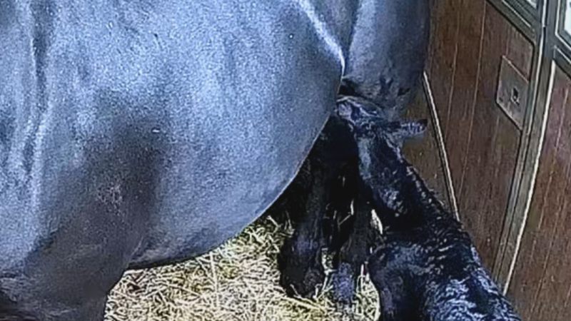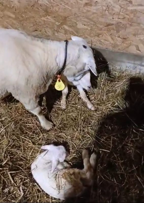 Het nageboorte kwam vlot af en was compleet. Iefke was een helder en vlug veulen. Ze stond snel en ging op zoek naar het uier. Hanna liet duidelijk blijken dat het uier erg gevoelig was. Ze was niet gemeen maar bleef ook niet staan waardoor Iefke het uier moeilijk kon pakken. Met een klein beetje begeleiding verliep dit al heel snel goed en liet Hanna, Iefke goed drinken. Toen ik een foto hiervan stuurde naar de eigenaren was ik niet de enige die wakker was. Op Ameland werden die nacht veel lammetjes geboren bij Martijn en Tamara in de stal en kreeg ik een leuke foto van de lammetjes terug. Prachtig al dit nieuwe leven.