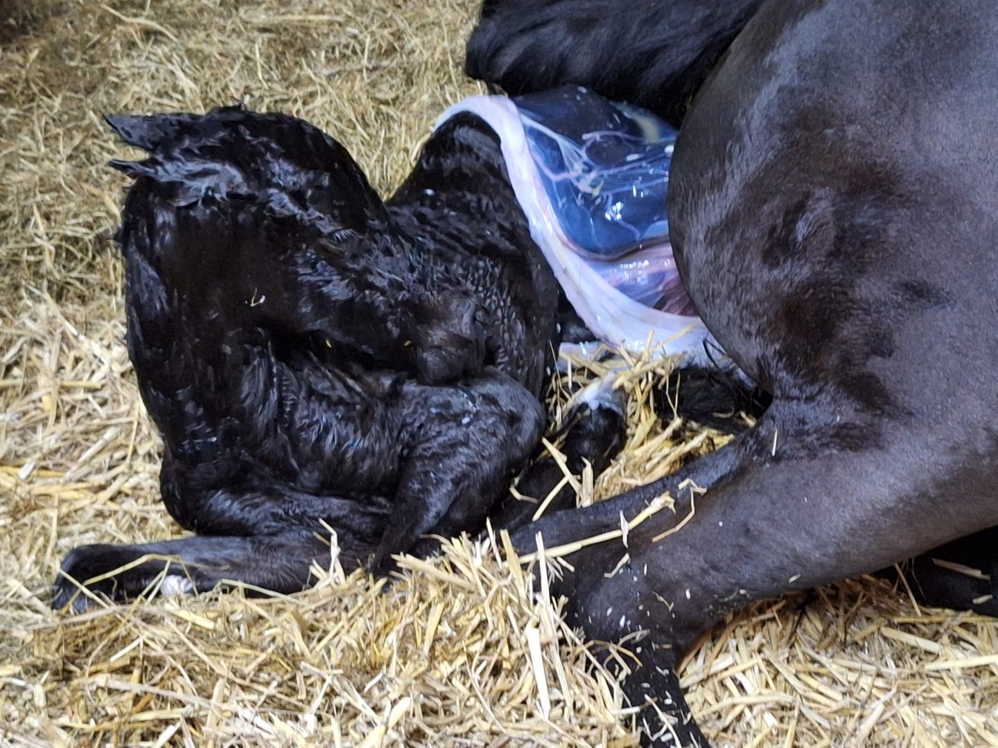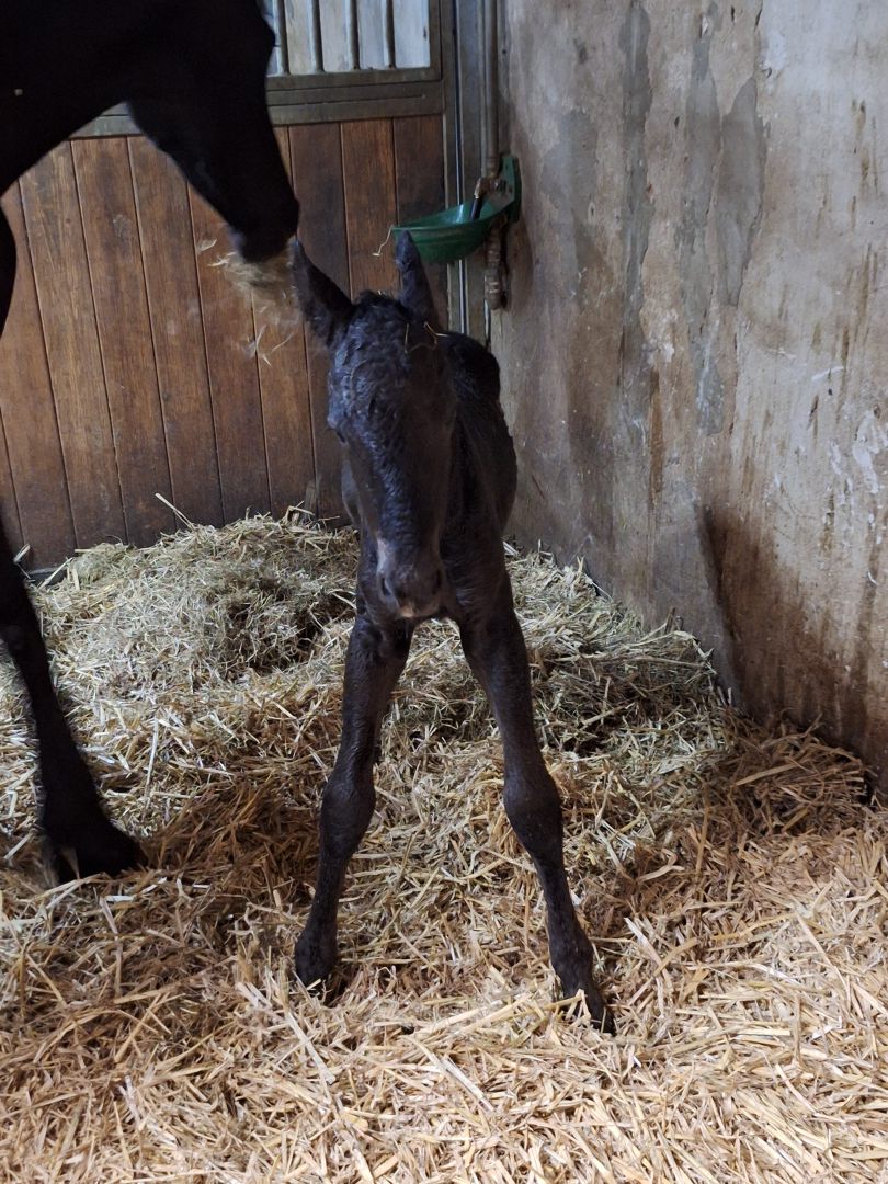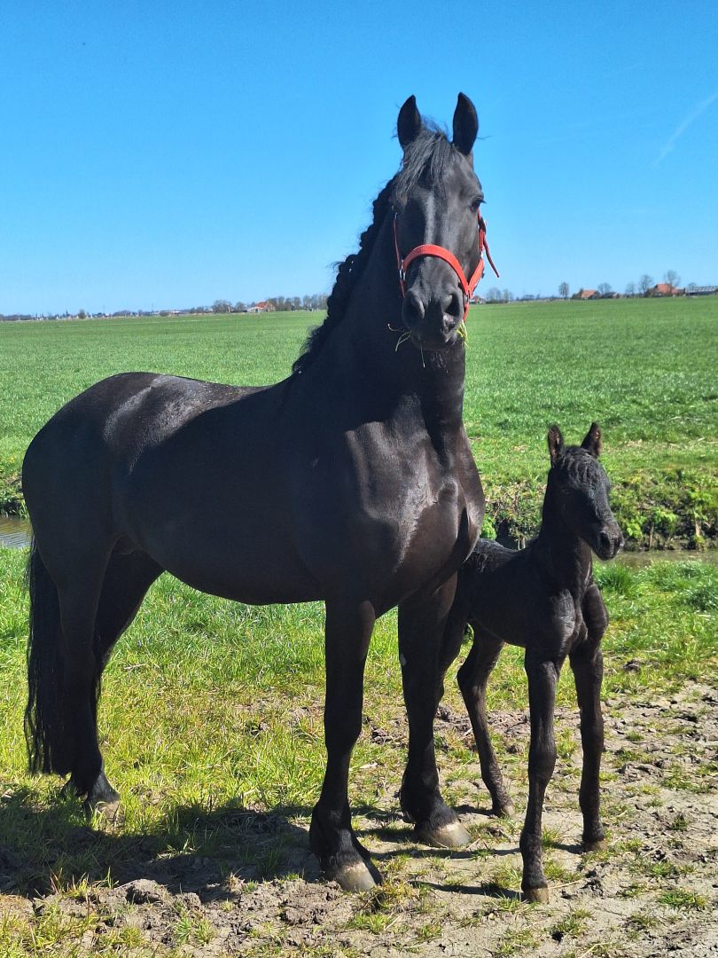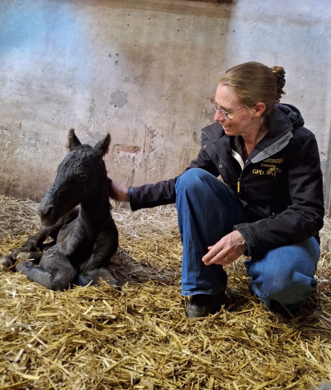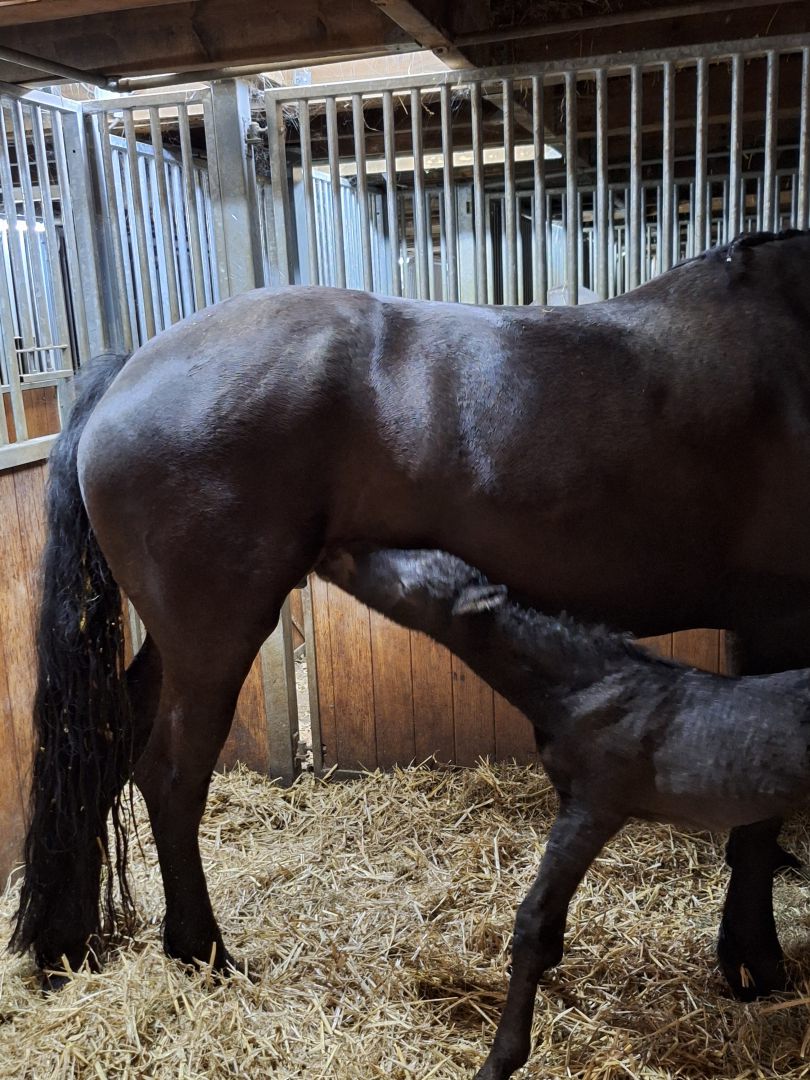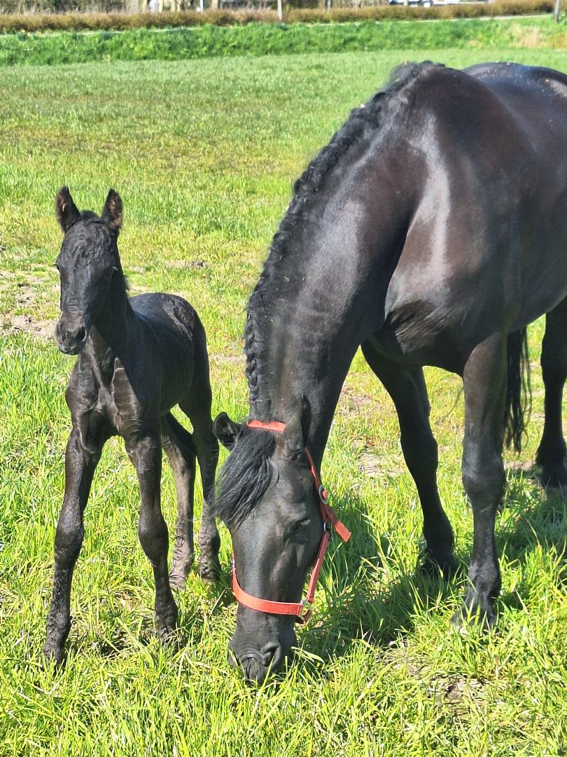 Onze zelf gefokte Friese merrie Richtsje fan de Fiifhoeke ster AAA (v. Omer 493) was 24 april uitgerekend van haar eerste veulen (v. Elger 536). Af en aan liet Richtsje zo nu en dan een miniem drupje hars flonkeren aan haar uier. Toen we Paaszondag gingen aflichten zagen we na een avondje gezellig Monopoly te hebben gespeeld met het gezin dat Richtsje met een dikke drup melk aan het uier stond. Ook de banden bleken al slap. Dus gauw het geboortealarm geinstalleerd. Terwijl ik net onder de douche stond met de shampoo in het haar ging het geboortealarm al af. Geen tijd om haar uit te spoelen of af te drogen, dus met een shirtje aan, gauw naar de kraamstal gedraafd. Daar lag Richtsje te bevallen. Maar liefst 19 dagen te vroeg. Wat kan de natuur toch snel! Onder toeziend oog van ons gezin werd er een heel mooi veulen geboren. Richtsje ontpopte zich direct als een geboren moeder. En natuurlijk was daar ook weer het moment van de geslachtsonthulling. Dit keer zijn we gezegend met een merrieveulen! Ijmkje fan de Fiifhoeke. Een mooie belofte voor onze fokkerij. Na onze eerste zorg te hebben verleend gingen we naar de keuken om ze even alleen te laten en ze via de camera in de gaten te houden. Ik kon even verder douchen en daarna natuurlijk een poppeslok met het gezin in de keuken. Alles verliep verder volgens het boekje. Wat een prachtige Pasen.