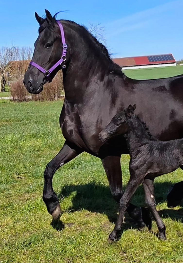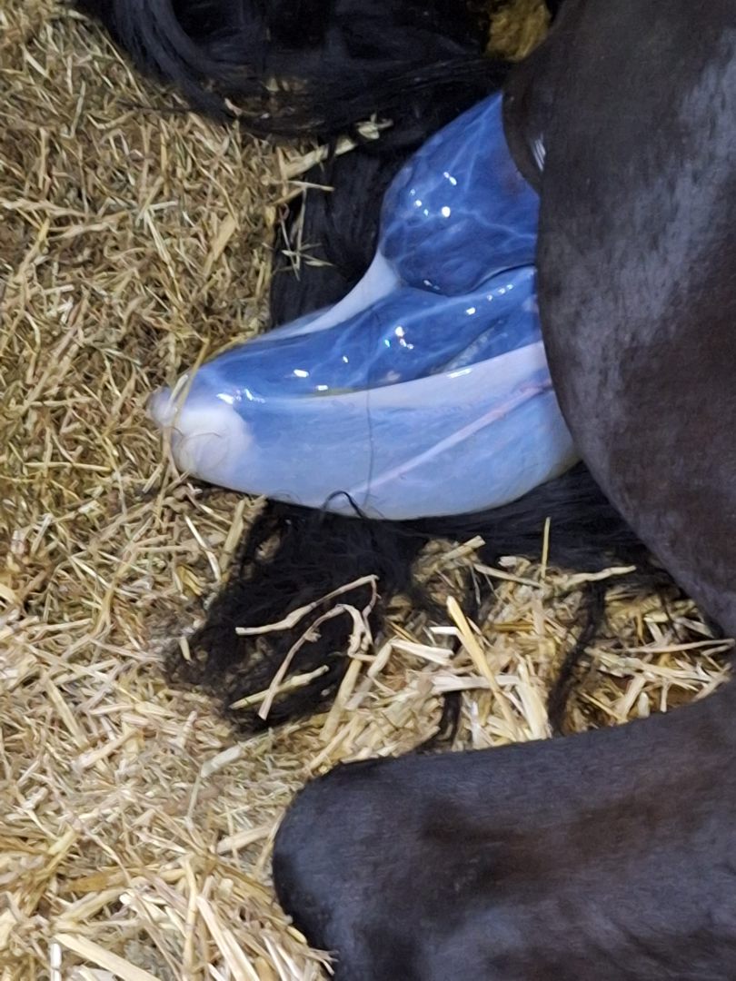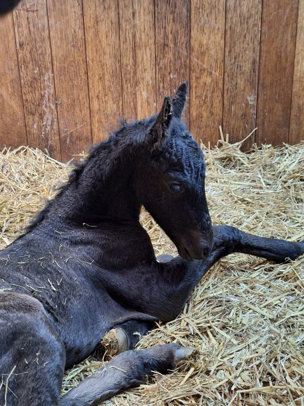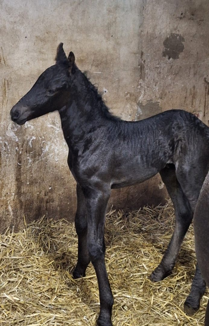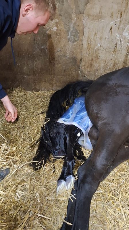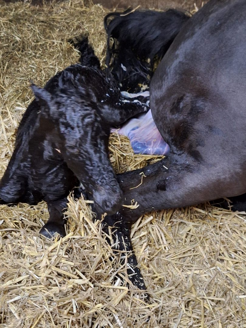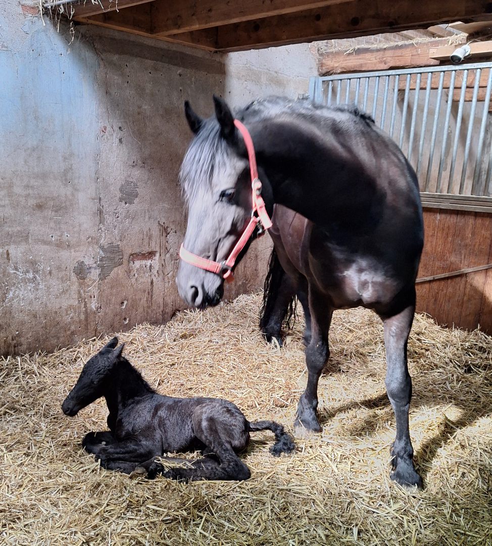 Onze zelf gefokte Friese merrie Richtsje fan de Fiifhoeke ster AAA (v. Omer 493) was 24 april uitgerekend van haar eerste veulen (v. Elger 536). Af en aan liet Richtsje zo nu en dan een miniem drupje hars flonkeren aan haar uier. Toen we Paaszondag gingen aflichten zagen we na een avondje gezellig Monopoly te hebben gespeeld met het gezin dat Richtsje met een dikke drup melk aan het uier stond. Ook de banden bleken al slap. Dus gauw het geboortealarm geinstalleerd. Terwijl ik net onder de douche stond met de shampoo in het haar ging het geboortealarm al af. Geen tijd om haar uit te spoelen of af te drogen, dus met een shirtje aan, gauw naar de kraamstal gedraafd. Daar lag Richtsje te bevallen. Maar liefst 19 dagen te vroeg. Wat kan de natuur toch snel! Onder toeziend oog van ons gezin werd er een heel mooi veulen geboren. Richtsje ontpopte zich direct als een geboren moeder. En natuurlijk was daar ook weer het moment van de geslachtsonthulling. Dit keer zijn we gezegend met een merrieveulen! Ijmkje fan de Fiifhoeke. Een mooie belofte voor onze fokkerij. Na onze eerste zorg te hebben verleend gingen we naar de keuken om ze even alleen te laten en ze via de camera in de gaten te houden. Ik kon even verder douchen en daarna natuurlijk een poppeslok met het gezin in de keuken. Alles verliep verder volgens het boekje. Wat een prachtige Pasen.