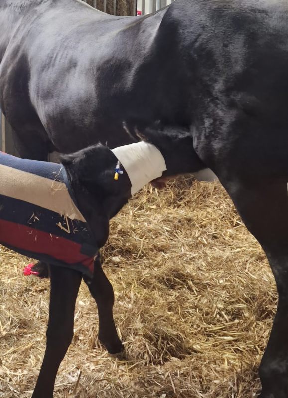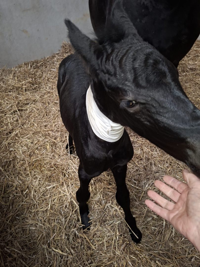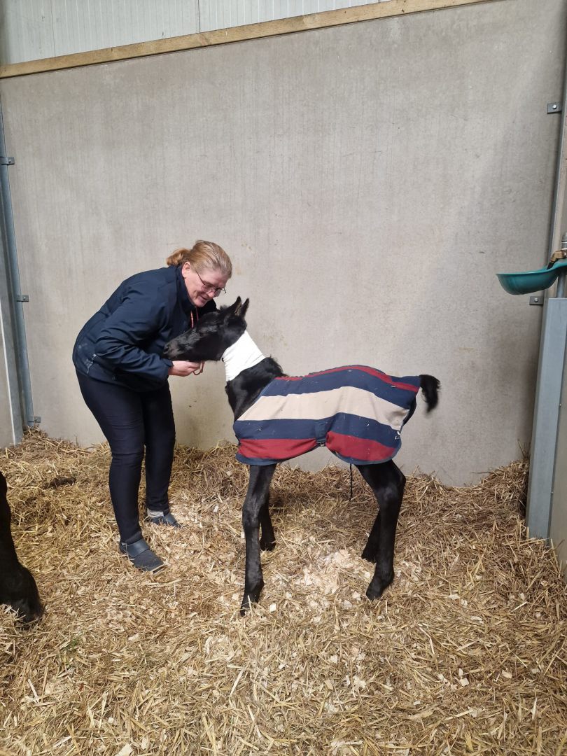 De Friese stermerrie Cathariena K. (v. Folkert 353) in eigendom van Ria Ruisendaal werd 2 april bij ons in de Kraamstal gebracht, drachtig van Mans 543 en 15 april uitgerekend. Cathariena is een ervaren moeder en we konden duidelijk zien dat de bevalling 16 april in aantocht was. Om ca 20.30u 's avonds ging het geboortealarm af. Cathariena lag te bevallen. Echter de uitdrijving vorderde niet. Cathariena had ook bijna geen weeen. Dus gevoeld of het veulen goed lag. We voelden 1 voorbeen, verder niks. Dus dierenartsenpraktijk It Griene Hert gebeld en ondertussen met Cathariene gaan lopen. De veearts van It Griene Hert kwam gauw maar hij constateerde ook dat het veulen niet goed lag en een sectio geboden was. De veearts gaf Cathariena medicatie om de baarmoeder te ontspannen en wij spoeden zo snel we konden naar Paardenkliniek Wolvega. Daar stond een heel team klaar. Er werd nog snel een keer gevoeld of het veulen per ongeluk toch goed was gaan liggen maar dat was niet het geval en dus ging Cathariena door naar de operatiekamer voor een sectio. Er werd een hengstveulen geboren. Hidde. Vanaf het begin deed Hidde het heel goed. En ook Cathariena kwam goed uit de operatie. Dankzij het deskundig ingrijpen en de professionele zorgen van zowel It Griene Hert als Paardenkliniek Wolvega hebben zowel de merrie als het veulen het gered, waarvoor onze grote dank. Ria van harte gefeliciteerd met Hidde. Na een zorgelijke start hopen we dat je nu mag genieten van Cathariena en Hidde.