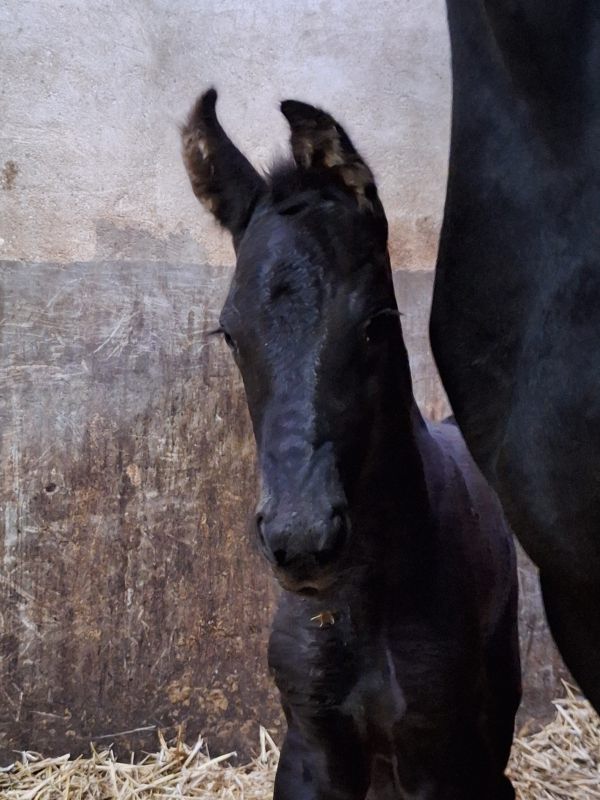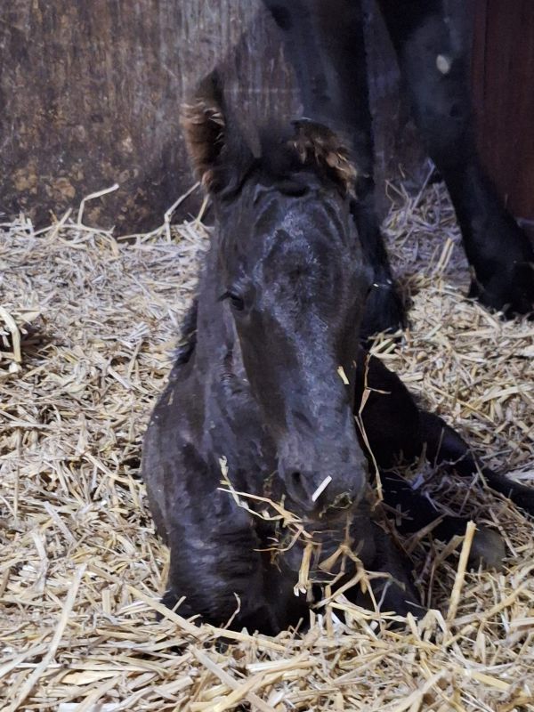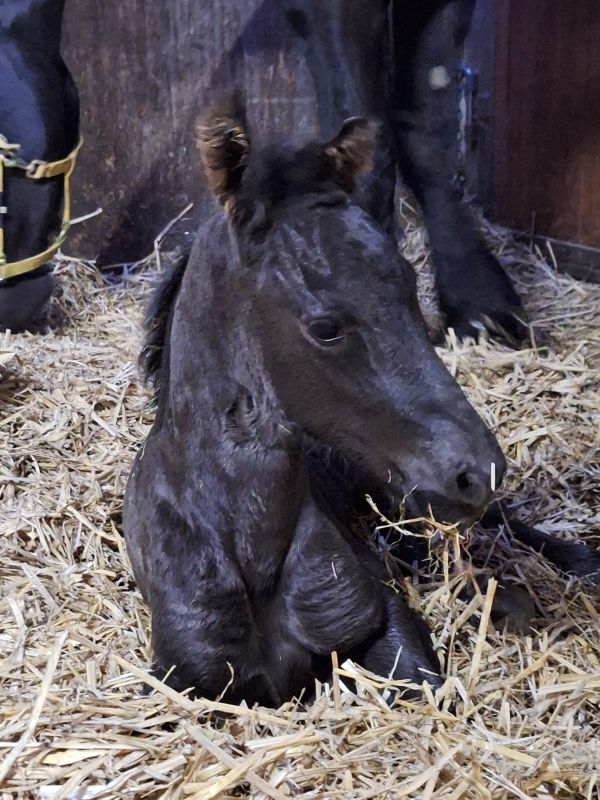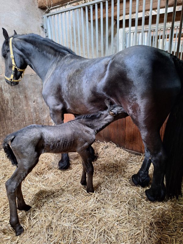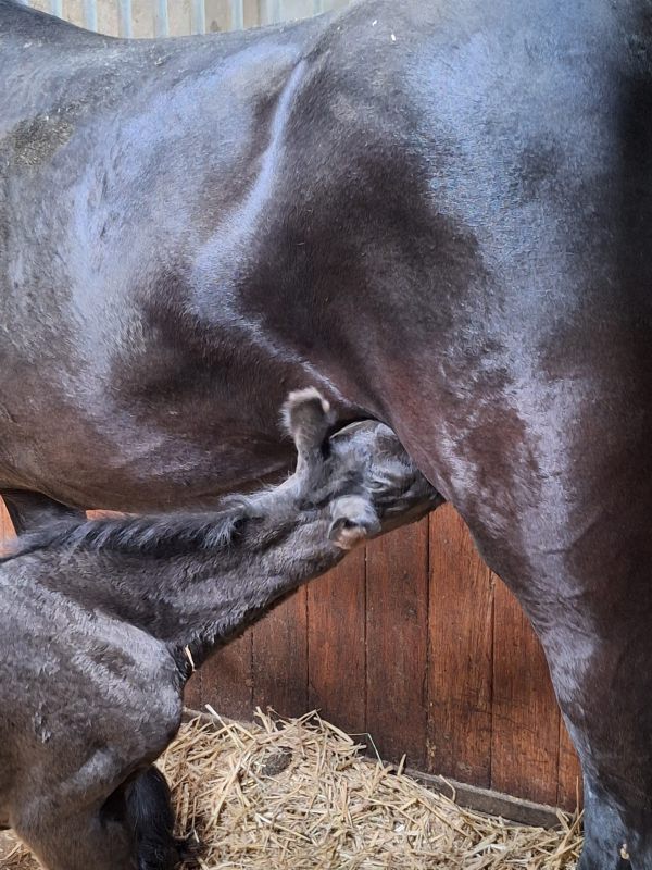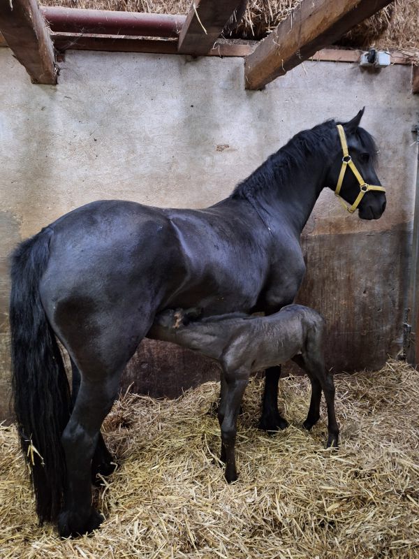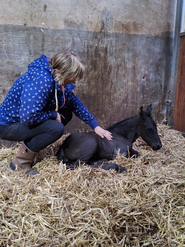 De 5 jarige Friese merrie Sanne fan it Jaachpaad (v.Tiede 501) in eigendom van Grietje Smit kwam 3 april bij ons in de Kraamstal. Ze was 29 april uitgerekend en drachtig van Bartele 472 en drachtig van haar eerste veulentje. Sanne liet eigenlijk weinig voortekenen zien. Haar uier was nog helemaal opgetrokken en de banden voelden nog niet zo slap. Toch kondigde de bevalling zich maandag 20 april om ca 4.30u aan. Sanne beviel van een muisgrijs, luxe merrieveulentje: Gerline. Sanne was eerst beduusd en moest bijkomen maar had wel interesse in het veulen en begon het mooi te slikken. Gerline kwam vlot in de benen en ging op zoek naar het uier. Dit vond Sanne niet fijn. Sanne bleef rondjes lopen en als Gerline wel in de buurt van het uier kwam, probeerde Sanne, Gerline weg te slaan met een been. Niet heel gemeen maar ook niet lief. Daarbij kwam dat het uier nog zo minimaal gevuld was en heel kleine speentjes had dat het voor Gerline heel moeilijk was om het uier te vinden/pakken. Dus onder begeleiding Sanne gemolken en de biest met de fles toegediend. Het melken liet Sanne redelijk goed toe.Met een vol buikje kon Gerline eerst even slapen. Toen ze weer op zoek ging naar het uier was het uier nog niet voldoende ontplooid en voor Gerline nog niet te pakken. Dus nogmaals Sanne gemolken en Gerline de fles gegeven. Sanne liet het melken nu al goed toe. Het uier werd nu ook voller en de speentjes kwamen meer uit, Na nog een keer melken lukte het Gerline om zelf het uier te pakken en liet Sanne het keurig toe. Wat fijn als het zich zo goed ontwikkelt. De nageboorte kwam op tijd af en was compleet. De biest van goede kwaliteit; brixwaarde >30. De volgende dag kwam EquiLife paardenartsen voor de gezondheidscheck. Sanne en Gerline werden gezond bevonden en Gerline had voldoende antistoffen opgenomen via de biest. IgG>800. Grietje gefeliciteerd met je prachtig mooie veulen!